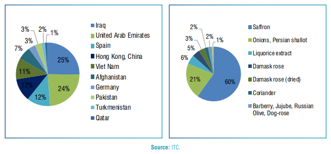 While precise numbers are difficult to determine, global demand for medicinal herbs is large and growing. The drivers of this demand are factors such as ageing populations in developed countries, the rise in chronic disease and unhealthy lifestyles, the rising costs of medical treatments and the stress associated with modern lifestyles. An estimated 4,000–6,000 species are traded globally, providing a source of income for rural populations. Iran has the potential to leverage its natural diversity of medicinal plants, heritage of more than 3,000 years of traditional medicine, existing capacities and widespread natural and organic cultivation methods, and innovations in supplying global demand. The two major exported products are saffron and Persian shallots, together representing approximately 81% of exports from the sector, with considerable growth in recent years (Figure 2). Exports of other medicinal herbs have been stagnant. The United Arab Emirates and the Kingdom of Spain together represent almost 50% of Iran’s total saffron exports. Much of the saffron sold to Spain is eventually re-exported.