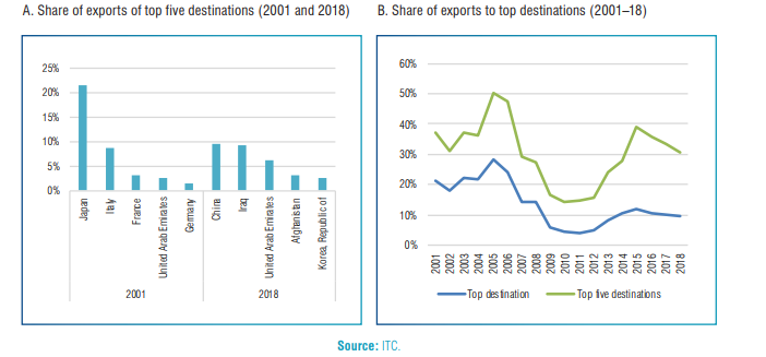 Iran’s strategic geographical position imparts strong potential for fostering regional integration by facilitating robust connectivity to Central Asia (via Turkmenistan), to Europe (via the Republic of Turkey), to the Mediterranean countries (via Iraq, and now India) and beyond (through Chabahar Port). This strategic position in West Asia, bordering the Caspian Sea, Persian Gulf and the Gulf of Oman close to shipping lands and key markets, has always part of Iran’s larger positioning strategy, and serves as a valuable base for accessing markets. Iran has been in discussions with neighboring partners such as Pakistan, Oman, Qatar and Iraq (Basra) for using their shipping lines and ports. Iran’s trade has shifted towards emerging economies in the region and East Asia, signaling gradual momentum in terms of market diversification, though considerable concentration in export markets remains (Figure 1). By value, the most important importers of Iranian goods exports in 2018 were China (9.5%), Iraq (9.3%), the United Arab Emirates (6.2%), Afghanistan (3.0%) and the Republic of Korea (2.7%). Market diversification has the potential to improve the scale of Iran’s exporting while helping to mitigate the effects of economic headwinds.