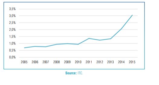 Globally, the information and communications technology sector accounts for a small, but growing share of trade, led by large producers such as China, the Federal Republic of Germany and the United States, which are the largest contributions to exports. Nevertheless, ICT has proven to be important to Iran’s growth, and as tradable services these have significant potential to drive export growth. However, challenges related to firms’ domestic focus and the policy and entrepreneurship environment can be adequately addressed for this growth potential to be realized. The software development, financial technology (fintech) and e-commerce subsectors are particularly promising, and are the focus of the sector strategy. Iran’s ICT export potential has been demonstrated in the past. Computer services exports, for example, have been small, but are growing quickly as a share of total services exports. In 2005, these exports accounted for just 0.7% of services exports, though this increased to 3% in 2015, when they were worth $338 million (Figure 4). Its performance has been driven by investment in ICT infrastructure, domestic demand, the government’s recognition of the sector’s potential in terms of its direct economic contribution and as a leader in the development of a knowledge-based economy, and the development of required skills.