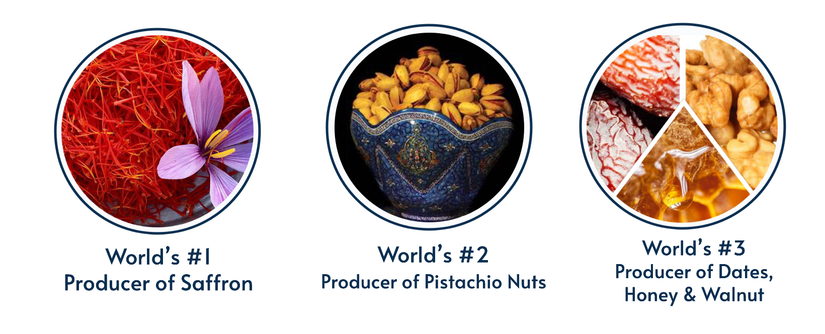 As the world’s largest producer of saffron, second-biggest producer of pistachios and the third-largest producer of dates, honey, and walnuts in the world, Iran has been among the top exporters of agri-food products in the world, also the world’s top producers of many agricultural products.
